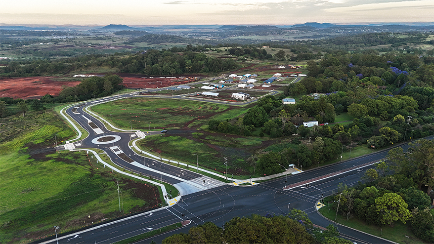 RMA collaborated with TMR to determine suitable outcomes for the conversion of the existing New England Highway and Murphys Creek Road intersection. The works included upgrading the existing T-intersection into a 4-way signalised intersection that is now used as the primary access for the development. The new intersection leg crosses an existing trunk raw water mains supplying raw water to Council’s Mt Kynoch Water Treatment Plant, requiring suitable protection measures to be put in place.