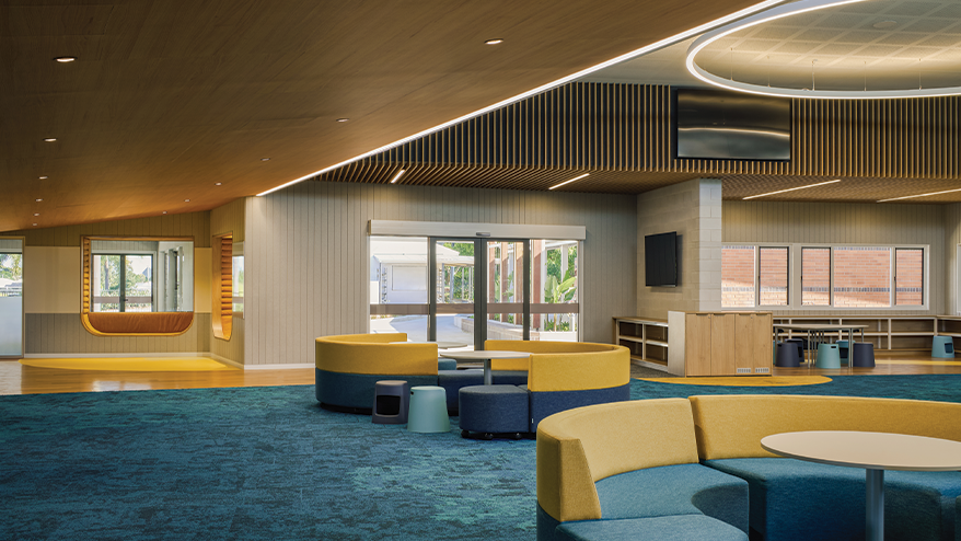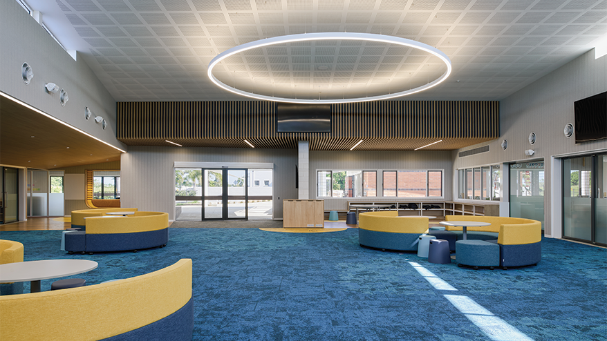 Our structural team achieved significant cost savings through an alternative solution to demolish the existing facilities and design a completely new structure. The new design features an expansive, central open plan learning area, supported by 9 surrounding contemporary learning rooms and breakout spaces. The building combines elevated ceilings and large glass panel windows to harness natural light, providing students with a bright and welcoming learning environment.